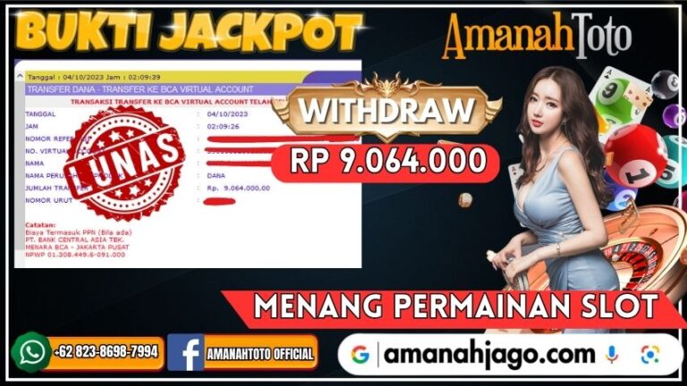 AMANAHTOTO BUKTI JACKPOT LUNAS PERMAINAN SLOT PRAGMATIC Rp 9.064.000 Amanahtoto – Adalah Agen judi online terpercaya dan pastinya gacor yang telah membuktikan kemenangan member lewat bukti jeckpot. Dengan bukti jeckpot setiap player dapat mengetahui bahwa situs Amanahtoto memiliki tingkat kualitas terbaik dari kemenangan di game dan dijamin aman terpercaya untuk player yang ingin mencoba merasakan kemenangan dalam permainan…