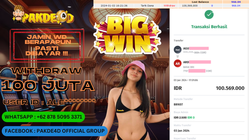 Selamat Kepada Member Setia PAKDE4D dengan USER ID : ALE******** di PERMAINAN SLOT sebesar Rp. 100.569.000,- LUNAS langsung mendarat ke rekening tanpa bertele – tele. Terimakasih telah mempercayakan PAKDE4D sebagai Situs Bandar Terpercaya dan Terjamin Aman! Tunggu apalagi? Daftar sekarang juga bersama PAKDE4D dan dapatkan berbagai promo menarik setiap harinya.