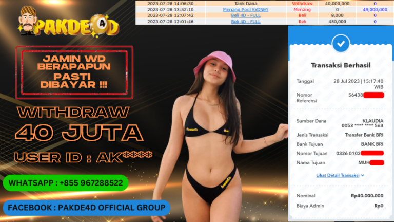 PAKDE4D – Situs Bandar Togel Online, Live Casino dan Slot Online Terpercaya yang terbukti membayar berapapun kemenangan Anda. Jika Anda masih mencari Situs Bandar Terpercaya, jangan ragu untuk bergabung bersama PAKDE4D. Dalam 1 akun Anda bisa menikmati semua permainan yang disediakan dengan minimal deposit hanya Rp. 10.000,- melalui transaksi Bank Lokal Indonesia dan Dompet Digital…