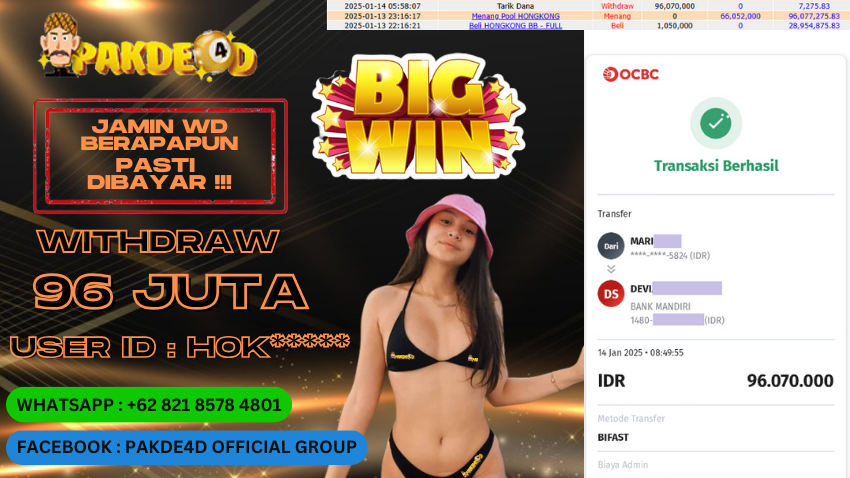 Selamat Kepada Member Setia PAKDE4D dengan USER ID : HOK***** di PERMAINAN HONGKONG sebesar Rp. 96.070.000,- LUNAS langsung mendarat ke rekening tanpa bertele – tele. Terimakasih telah mempercayakan PAKDE4D sebagai Situs Bandar Terpercaya dan Terjamin Aman! Tunggu apalagi? Daftar sekarang juga bersama PAKDE4D dan dapatkan berbagai promo menarik setiap harinya.