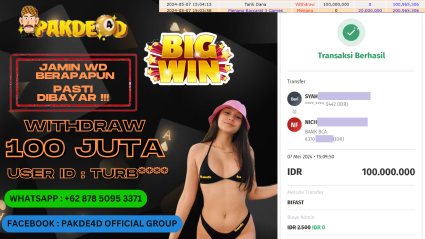 Selamat Kepada Member Setia PAKDE4D dengan USER ID : TUR***** di PERMAINAN LIVE CASINO BACCARAT sebesar Rp. 100.000.000,- LUNAS langsung mendarat ke rekening tanpa bertele – tele. Terimakasih telah mempercayakan PAKDE4D sebagai Situs Bandar Terpercaya dan Terjamin Aman! Tunggu apalagi? Daftar sekarang juga bersama PAKDE4D dan dapatkan berbagai promo menarik setiap harinya.