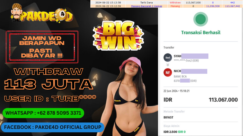 Selamat Kepada Member Setia PAKDE4D dengan USER ID : TUR***** di PERMAINAN LIVE CASINO BACCARAT sebesar Rp. 113.067.000,- LUNAS langsung mendarat ke rekening tanpa bertele – tele. Terimakasih telah mempercayakan PAKDE4D sebagai Situs Bandar Terpercaya dan Terjamin Aman! Tunggu apalagi? Daftar sekarang juga bersama PAKDE4D dan dapatkan berbagai promo menarik setiap harinya.