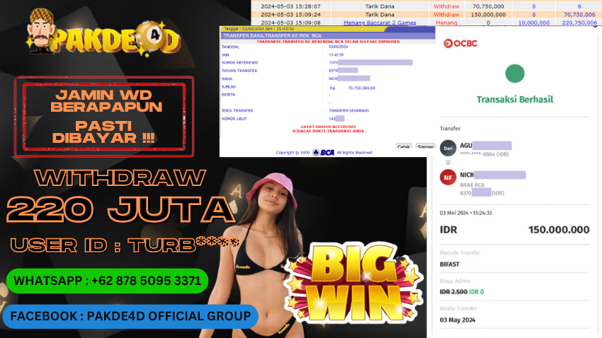 PAKDE4D JACKPOT DI PERMAINAN LIVE CASINO BACCARAT RP. 220.000.000,- LUNAS