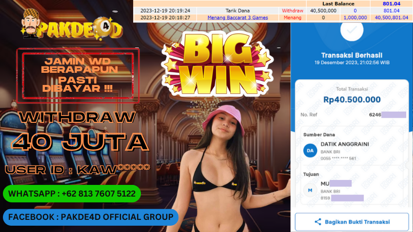 Selamat Kepada Member Setia PAKDE4D dengan USER ID : KAW***** di PERMAINAN LIVE CASINO BACCARAT sebesar Rp. 40.500.000,- LUNAS langsung mendarat ke rekening tanpa bertele – tele. Terimakasih telah mempercayakan PAKDE4D sebagai Situs Bandar Terpercaya dan Terjamin Aman! Tunggu apalagi? Daftar sekarang juga bersama PAKDE4D dan dapatkan berbagai promo menarik setiap harinya.