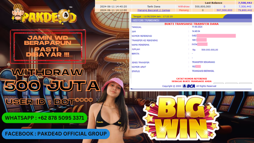 Selamat Kepada Member Setia PAKDE4D dengan USER ID : DOT***** di PERMAINAN LIVE CASINO BACCARAT sebesar Rp. 500.000.000,- LUNAS langsung mendarat ke rekening tanpa bertele – tele. Terimakasih telah mempercayakan PAKDE4D sebagai Situs Bandar Terpercaya dan Terjamin Aman! Tunggu apalagi? Daftar sekarang juga bersama PAKDE4D dan dapatkan berbagai promo menarik setiap harinya.