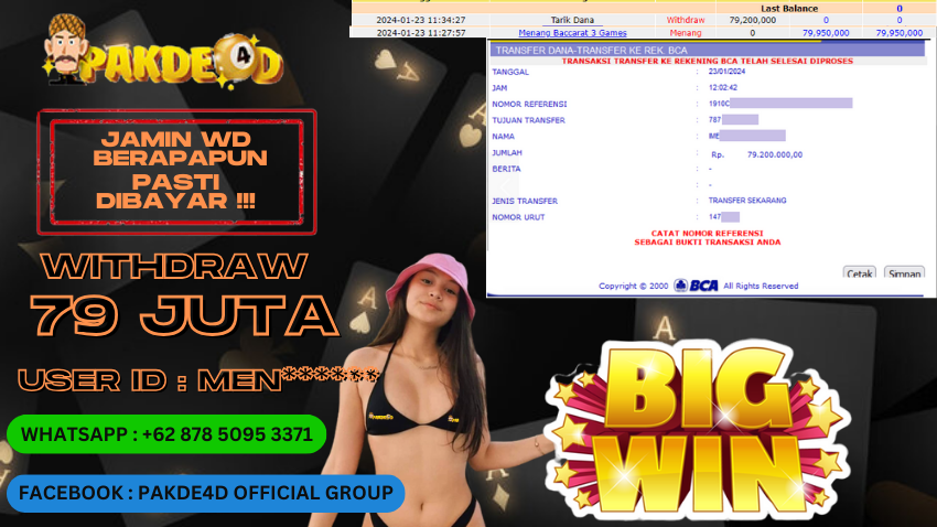 Selamat Kepada Member Setia PAKDE4D dengan USER ID : MEN****** di PERMAINAN LIVE CASINO BACCARAT sebesar Rp. 79.200.000,- LUNAS langsung mendarat ke rekening tanpa bertele – tele. Terimakasih telah mempercayakan PAKDE4D sebagai Situs Bandar Terpercaya dan Terjamin Aman! Tunggu apalagi? Daftar sekarang juga bersama PAKDE4D dan dapatkan berbagai promo menarik setiap harinya.