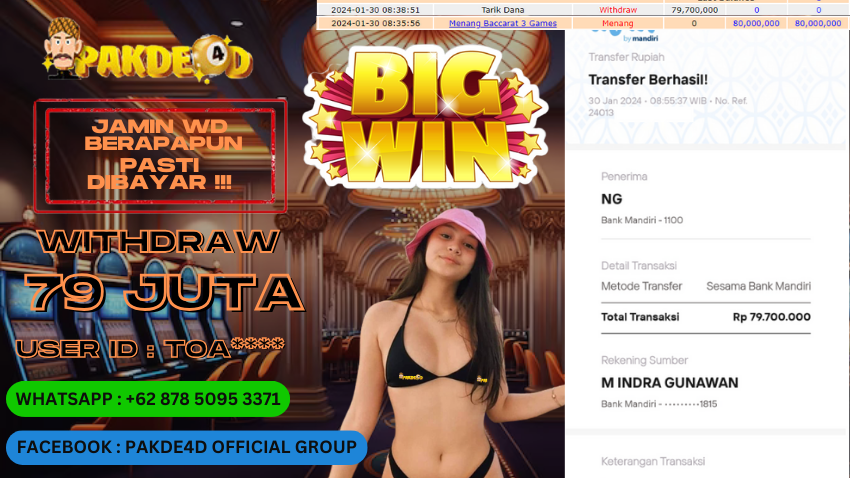 Selamat Kepada Member Setia PAKDE4D dengan USER ID : TOA**** di PERMAINAN LIVE CASINO BACCARAT sebesar Rp. 79.700.000,- LUNAS langsung mendarat ke rekening tanpa bertele – tele. Terimakasih telah mempercayakan PAKDE4D sebagai Situs Bandar Terpercaya dan Terjamin Aman! Tunggu apalagi? Daftar sekarang juga bersama PAKDE4D dan dapatkan berbagai promo menarik setiap harinya.