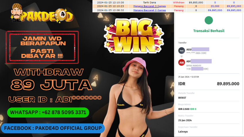 Selamat Kepada Member Setia PAKDE4D dengan USER ID : ADI******* di PERMAINAN LIVE CASINO BACCARAT sebesar Rp. 89.895.000,- LUNAS langsung mendarat ke rekening tanpa bertele – tele. Terimakasih telah mempercayakan PAKDE4D sebagai Situs Bandar Terpercaya dan Terjamin Aman! Tunggu apalagi? Daftar sekarang juga bersama PAKDE4D dan dapatkan berbagai promo menarik setiap harinya.