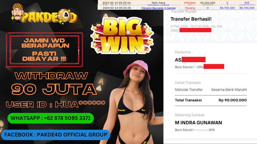Selamat Kepada Member Setia PAKDE4D dengan USER ID : HUA****** di PERMAINAN LIVE CASINO BACCARAT sebesar Rp. 90.000.000,- LUNAS langsung mendarat ke rekening tanpa bertele – tele. Terimakasih telah mempercayakan PAKDE4D sebagai Situs Bandar Terpercaya dan Terjamin Aman! Tunggu apalagi? Daftar sekarang juga bersama PAKDE4D dan dapatkan berbagai promo menarik setiap harinya.