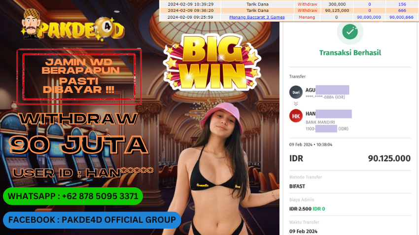 Selamat Kepada Member Setia PAKDE4D dengan USER ID : HAN***** di PERMAINAN LIVE CASINO BACCARAT sebesar Rp. 90.125.000,- LUNAS langsung mendarat ke rekening tanpa bertele – tele. Terimakasih telah mempercayakan PAKDE4D sebagai Situs Bandar Terpercaya dan Terjamin Aman! Tunggu apalagi? Daftar sekarang juga bersama PAKDE4D dan dapatkan berbagai promo menarik setiap harinya.