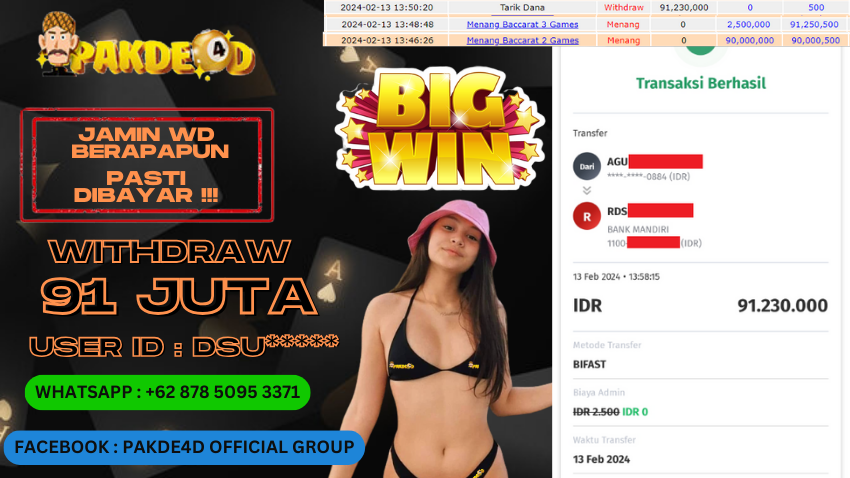 Selamat Kepada Member Setia PAKDE4D dengan USER ID : DSU***** di PERMAINAN LIVE CASINO BACCARAT sebesar Rp. 91.230.000,- LUNAS langsung mendarat ke rekening tanpa bertele – tele. Terimakasih telah mempercayakan PAKDE4D sebagai Situs Bandar Terpercaya dan Terjamin Aman! Tunggu apalagi? Daftar sekarang juga bersama PAKDE4D dan dapatkan berbagai promo menarik setiap harinya.