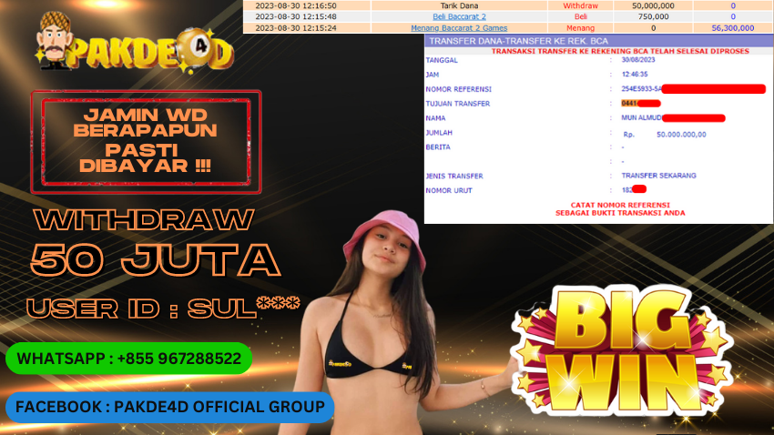 Selamat Kepada Member Setia PAKDE4D dengan USER ID : SULTA*** di PERMAINAN BACCARAT LIVE CASINO sebesar Rp. 50.000.000,- LUNAS langsung mendarat ke rekening tanpa bertele – tele. Terimakasih telah mempercayakan PAKDE4D sebagai Situs Bandar Terpercaya dan Terjamin Aman! Tunggu apalagi? Daftar sekarang juga bersama PAKDE4D dan dapatkan berbagai promo menarik setiap harinya.