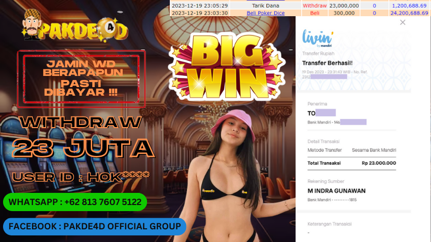 Selamat Kepada Member Setia PAKDE4D dengan USER ID : HOK**** di PERMAINAN LIVE CASINO POKER DICE sebesar Rp. 23.000.000,- LUNAS langsung mendarat ke rekening tanpa bertele – tele. Terimakasih telah mempercayakan PAKDE4D sebagai Situs Bandar Terpercaya dan Terjamin Aman! Tunggu apalagi? Daftar sekarang juga bersama PAKDE4D dan dapatkan berbagai promo menarik setiap harinya.