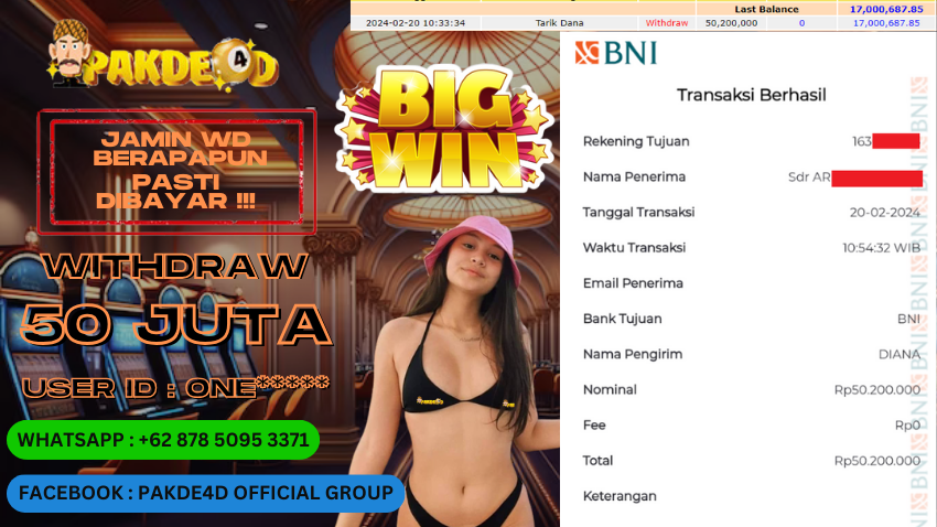Selamat Kepada Member Setia PAKDE4D dengan USER ID : ONE***** di PERMAINAN LIVE CASINO RED WHITE GAMES sebesar Rp. 50.200.000,- LUNAS langsung mendarat ke rekening tanpa bertele – tele. Terimakasih telah mempercayakan PAKDE4D sebagai Situs Bandar Terpercaya dan Terjamin Aman! Tunggu apalagi? Daftar sekarang juga bersama PAKDE4D dan dapatkan berbagai promo menarik setiap harinya.