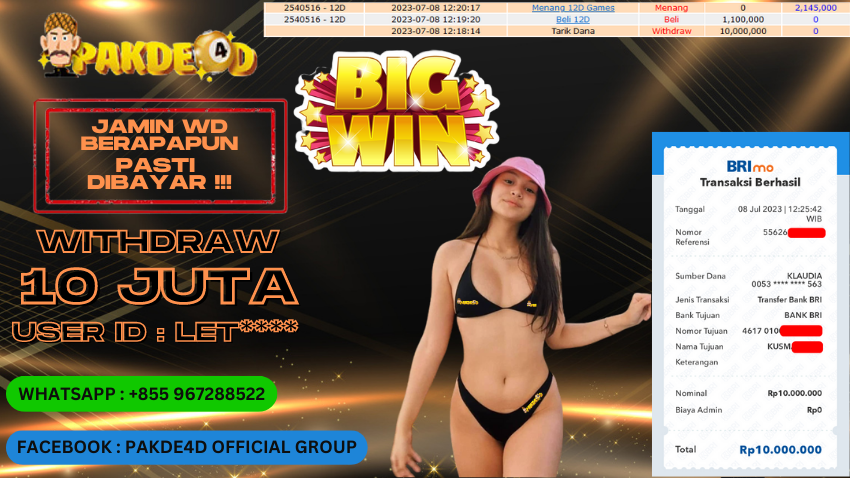 Selamat Kepada Member Setia PAKDE4D dengan USER ID : LET** di PERMAINAN LIVE CASINO sebesar Rp. 10.000.000,- LUNAS langsung mendarat ke rekening tanpa bertele – tele. Terimakasih telah mempercayakan PAKDE4D sebagai Situs Bandar Terpercaya dan Terjamin Aman! Tunggu apalagi? Daftar sekarang juga bersama PAKDE4D dan dapatkan berbagai promo menarik setiap harinya.