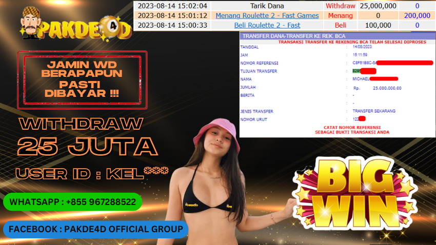 Selamat Kepada Member Setia PAKDE4D dengan USER ID : KEL*** di PERMAINAN LIVE CASINO ROULETTE sebesar Rp. 25.000.000,- LUNAS langsung mendarat ke rekening tanpa bertele – tele. Terimakasih telah mempercayakan PAKDE4D sebagai Situs Bandar Terpercaya dan Terjamin Aman! Tunggu apalagi? Daftar sekarang juga bersama PAKDE4D dan dapatkan berbagai promo menarik setiap harinya.