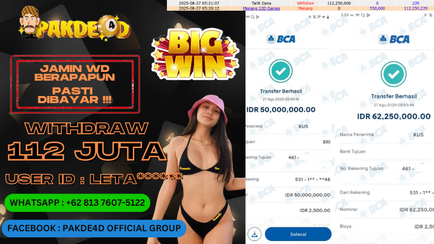 Selamat Kepada Member Setia PAKDE4D dengan USER ID : LETA****** di PERMAINAN LIVE GAME 12DSPIN sebesar Rp. 112.250.000,- LUNAS langsung mendarat ke rekening tanpa bertele – tele. Terimakasih telah mempercayakan PAKDE4D sebagai Situs Bandar Terpercaya dan Terjamin Aman! Tunggu apalagi? Daftar sekarang juga bersama PAKDE4D dan dapatkan berbagai promo menarik setiap harinya.