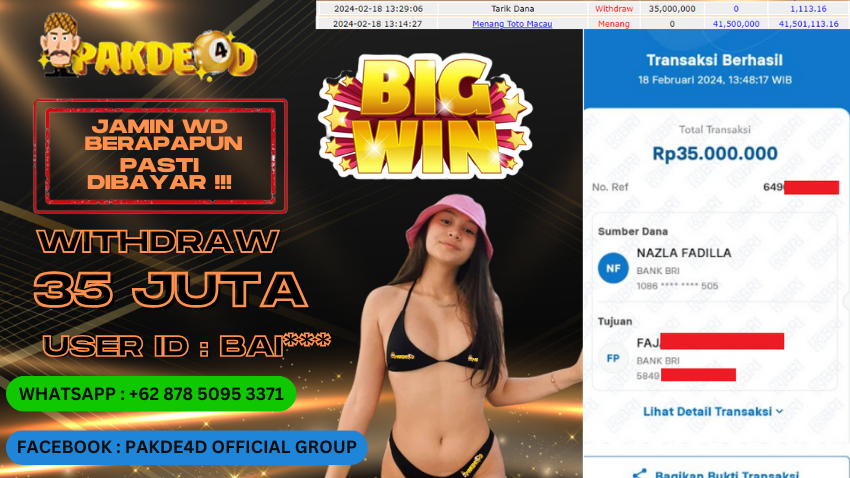 Selamat Kepada Member Setia PAKDE4D dengan USER ID : BAI*** di PERMAINAN LIVE GAME TOTO MACAU 4D JP RP. 35.000.000,- LUNAS LUNAS langsung mendarat ke rekening tanpa bertele – tele. Terimakasih telah mempercayakan PAKDE4D sebagai Situs Bandar Terpercaya dan Terjamin Aman! Tunggu apalagi? Daftar sekarang juga bersama PAKDE4D dan dapatkan berbagai promo menarik setiap harinya.