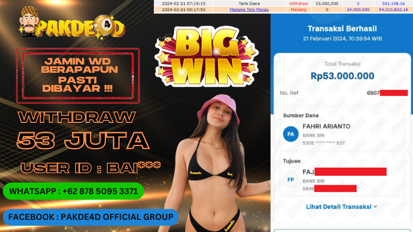 Selamat Kepada Member Setia PAKDE4D dengan USER ID : BAI*** di PERMAINAN LIVE GAME TOTO MACAU 4D JP RP. 53.000.000,- LUNAS LUNAS langsung mendarat ke rekening tanpa bertele – tele. Terimakasih telah mempercayakan PAKDE4D sebagai Situs Bandar Terpercaya dan Terjamin Aman! Tunggu apalagi? Daftar sekarang juga bersama PAKDE4D dan dapatkan berbagai promo menarik setiap harinya.