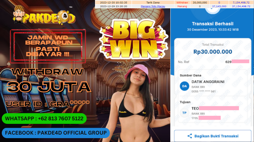 Selamat Kepada Member Setia PAKDE4D dengan USER ID : GRA***** di PERMAINAN LIVE GAME TOTO MACAU 5D JP RP. 30.000.000,- JUTA,DI BAYAR LUNAS langsung mendarat ke rekening tanpa bertele – tele. Terimakasih telah mempercayakan PAKDE4D sebagai Situs Bandar Terpercaya dan Terjamin Aman! Tunggu apalagi? Daftar sekarang juga bersama PAKDE4D dan dapatkan berbagai promo menarik setiap harinya.
