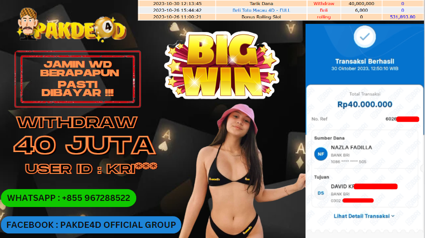 Selamat Kepada Member Setia PAKDE4D dengan USER ID : KRI*** di PERMAINAN SLOT sebesar Rp. 40.000.000,- LUNAS langsung mendarat ke rekening tanpa bertele – tele. Terimakasih telah mempercayakan PAKDE4D sebagai Situs Bandar Terpercaya dan Terjamin Aman! Tunggu apalagi? Daftar sekarang juga bersama PAKDE4D dan dapatkan berbagai promo menarik setiap harinya.