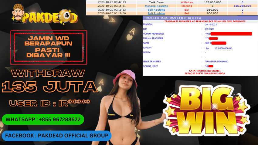 Selamat Kepada Member Setia PAKDE4D dengan USER ID : KO*** di PERMAINAN LIVE CASINO ROULETTE sebesar Rp. 135.000.000,- LUNAS langsung mendarat ke rekening tanpa bertele – tele. Terimakasih telah mempercayakan PAKDE4D sebagai Situs Bandar Terpercaya dan Terjamin Aman! Tunggu apalagi? Daftar sekarang juga bersama PAKDE4D dan dapatkan berbagai promo menarik setiap harinya.