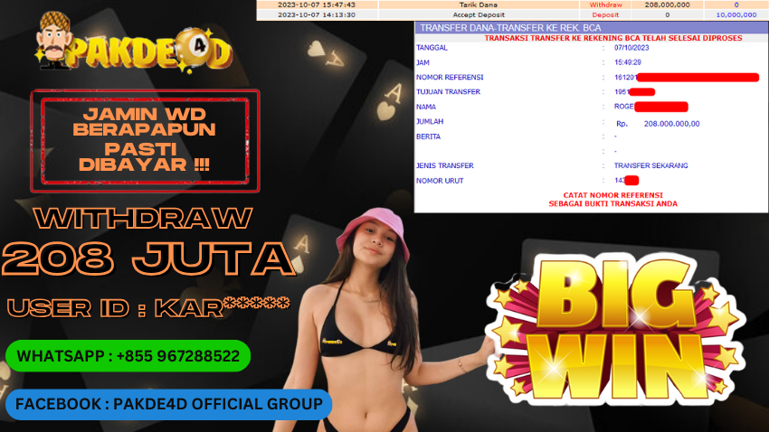 Selamat Kepada Member Setia PAKDE4D dengan USER ID : KAR*** di PERMAINAN SLOT sebesar Rp. 208.000.000,- LUNAS langsung mendarat ke rekening tanpa bertele – tele. Terimakasih telah mempercayakan PAKDE4D sebagai Situs Bandar Terpercaya dan Terjamin Aman! Tunggu apalagi? Daftar sekarang juga bersama PAKDE4D dan dapatkan berbagai promo menarik setiap harinya.
