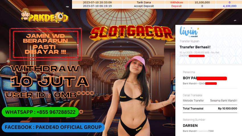 Selamat Kepada Member Setia PAKDE4D dengan USER ID : OMBO**** di PERMAINAN SLOT sebesar Rp. 10.000.000,- LUNAS langsung mendarat ke rekening tanpa bertele – tele. Terimakasih telah mempercayakan PAKDE4D sebagai Situs Bandar Terpercaya dan Terjamin Aman! Tunggu apalagi? Daftar sekarang juga bersama PAKDE4D dan dapatkan berbagai promo menarik setiap harinya.