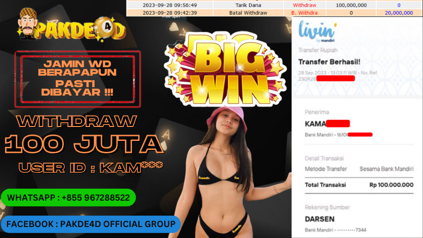 Selamat Kepada Member Setia PAKDE4D dengan USER ID : KAM*** di PERMAINAN SLOT sebesar Rp. 100.000.000,- LUNAS langsung mendarat ke rekening tanpa bertele – tele. Terimakasih telah mempercayakan PAKDE4D sebagai Situs Bandar Terpercaya dan Terjamin Aman! Tunggu apalagi? Daftar sekarang juga bersama PAKDE4D dan dapatkan berbagai promo menarik setiap harinya.