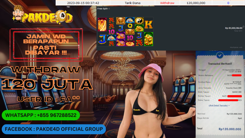 Selamat Kepada Member Setia PAKDE4D dengan USER ID : FA*** di PERMAINAN SLOT sebesar Rp.120.000.000,- LUNAS langsung mendarat ke rekening tanpa bertele – tele. Terimakasih telah mempercayakan PAKDE4D sebagai Situs Bandar Terpercaya dan Terjamin Aman! Tunggu apalagi? Daftar sekarang juga bersama PAKDE4D dan dapatkan berbagai promo menarik setiap harinya.