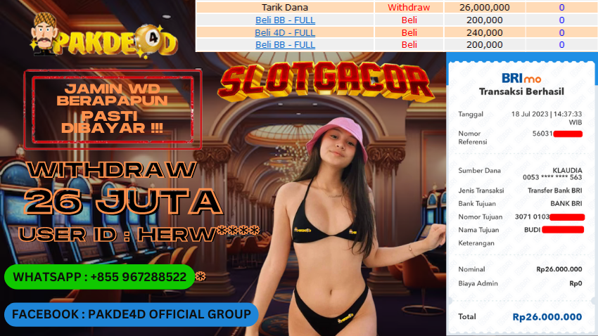 Selamat Kepada Member Setia PAKDE4D dengan USER ID : HERW*** di PERMAINAN SLOT sebesar Rp. 26.000.000,- LUNAS langsung mendarat ke rekening tanpa bertele – tele. Terimakasih telah mempercayakan PAKDE4D sebagai Situs Bandar Terpercaya dan Terjamin Aman! Tunggu apalagi? Daftar sekarang juga bersama PAKDE4D dan dapatkan berbagai promo menarik setiap harinya.