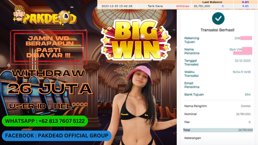 Selamat Kepada Member Setia PAKDE4D dengan USER ID : BEL**** di PERMAINAN SLOT sebesar Rp. 26.781.000,- LUNAS langsung mendarat ke rekening tanpa bertele – tele. Terimakasih telah mempercayakan PAKDE4D sebagai Situs Bandar Terpercaya dan Terjamin Aman! Tunggu apalagi? Daftar sekarang juga bersama PAKDE4D dan dapatkan berbagai promo menarik setiap harinya.