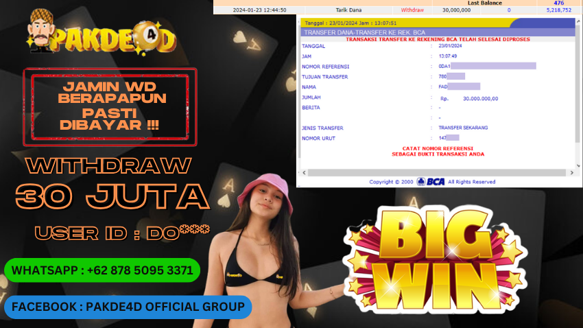 Selamat Kepada Member Setia PAKDE4D dengan USER ID : DO*** di PERMAINAN SLOT sebesar Rp. 30.000.000,- LUNAS langsung mendarat ke rekening tanpa bertele – tele. Terimakasih telah mempercayakan PAKDE4D sebagai Situs Bandar Terpercaya dan Terjamin Aman! Tunggu apalagi? Daftar sekarang juga bersama PAKDE4D dan dapatkan berbagai promo menarik setiap harinya.