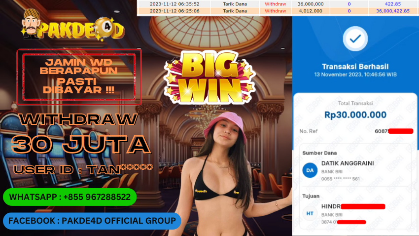 Selamat Kepada Member Setia PAKDE4D dengan USER ID : TAN*** di PERMAINAN SLOT sebesar Rp. 30.000.000,- LUNAS langsung mendarat ke rekening tanpa bertele – tele. Terimakasih telah mempercayakan PAKDE4D sebagai Situs Bandar Terpercaya dan Terjamin Aman! Tunggu apalagi? Daftar sekarang juga bersama PAKDE4D dan dapatkan berbagai promo menarik setiap harinya.