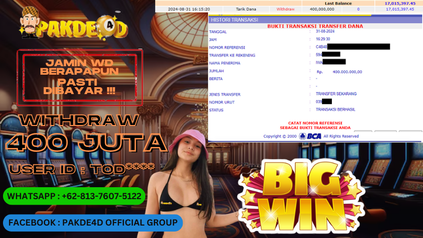 Selamat Kepada Member Setia PAKDE4D dengan USER ID : TOD**** di PERMAINAN SLOT sebesar Rp. 400.000.000,- LUNAS langsung mendarat ke rekening tanpa bertele – tele. Terimakasih telah mempercayakan PAKDE4D sebagai Situs Bandar Terpercaya dan Terjamin Aman! Tunggu apalagi? Daftar sekarang juga bersama PAKDE4D dan dapatkan berbagai promo menarik setiap harinya.