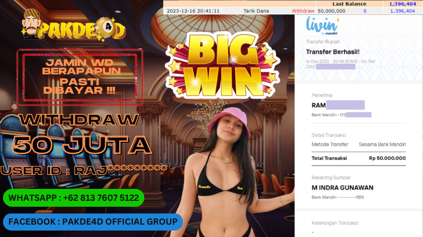 Selamat Kepada Member Setia PAKDE4D dengan USER ID : RAJ********* di PERMAINAN SLOT sebesar Rp. 50.000.000,- LUNAS langsung mendarat ke rekening tanpa bertele – tele. Terimakasih telah mempercayakan PAKDE4D sebagai Situs Bandar Terpercaya dan Terjamin Aman! Tunggu apalagi? Daftar sekarang juga bersama PAKDE4D dan dapatkan berbagai promo menarik setiap harinya.