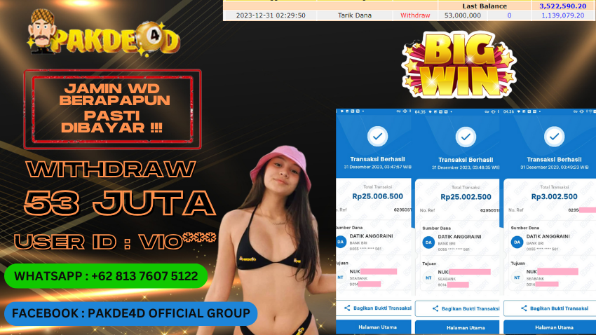 Selamat Kepada Member Setia PAKDE4D dengan USER ID : VIO*** di PERMAINAN SLOT sebesar Rp. 53.000.000,- LUNAS langsung mendarat ke rekening tanpa bertele – tele. Terimakasih telah mempercayakan PAKDE4D sebagai Situs Bandar Terpercaya dan Terjamin Aman! Tunggu apalagi? Daftar sekarang juga bersama PAKDE4D dan dapatkan berbagai promo menarik setiap harinya.