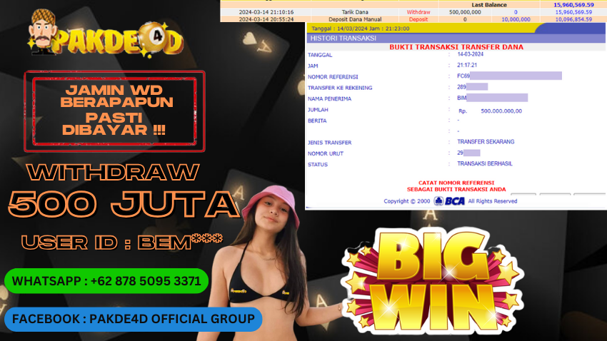 Selamat Kepada Member Setia PAKDE4D dengan USER ID : BEM*** di PERMAINAN SLOT SWEET BONANZA XMAS sebesar Rp. 500.000.000,- LUNAS langsung mendarat ke rekening tanpa bertele – tele. Terimakasih telah mempercayakan PAKDE4D sebagai Situs Bandar Terpercaya dan Terjamin Aman! Tunggu apalagi? Daftar sekarang juga bersama PAKDE4D dan dapatkan berbagai promo menarik setiap harinya.