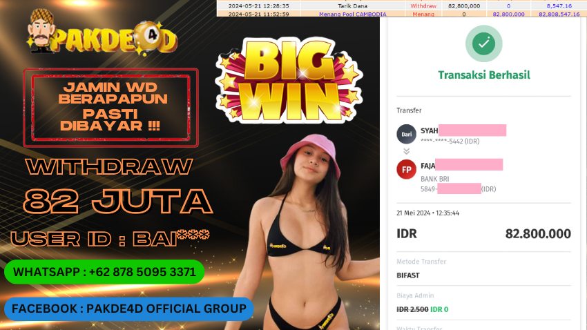Selamat Kepada Member Setia PAKDE4D dengan USER ID : BAI*** di PERMAINAN TOGEL PASARAN CAMBODIA POOLS sebesar Rp. 82.800.000,- LUNAS langsung mendarat ke rekening tanpa bertele – tele. Terimakasih telah mempercayakan PAKDE4D sebagai Situs Bandar Terpercaya dan Terjamin Aman! Tunggu apalagi? Daftar sekarang juga bersama PAKDE4D dan dapatkan berbagai promo menarik setiap harinya.