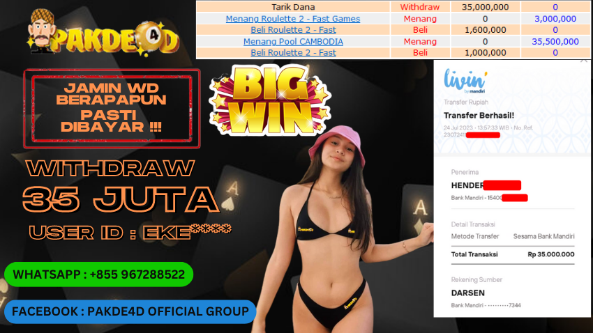 Selamat Kepada Member Setia PAKDE4D dengan USER ID : EKE**** di PERMAINAN TOGEL PASARAN CAMBODIA sebesar Rp. 35.000.000,- LUNAS langsung mendarat ke rekening tanpa bertele – tele. Terimakasih telah mempercayakan PAKDE4D sebagai Situs Bandar Terpercaya dan Terjamin Aman! Tunggu apalagi? Daftar sekarang juga bersama PAKDE4D dan dapatkan berbagai promo menarik setiap harinya.