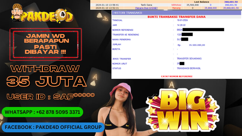Selamat Kepada Member Setia PAKDE4D dengan USER ID : SAF***** di PERMAINAN TOGEL PASARAN SYDNEY POOLS RP. 35.500.000,- LUNAS langsung mendarat ke rekening tanpa bertele – tele. Terimakasih telah mempercayakan PAKDE4D sebagai Situs Bandar Terpercaya dan Terjamin Aman! Tunggu apalagi? Daftar sekarang juga bersama PAKDE4D dan dapatkan berbagai promo menarik setiap harinya.