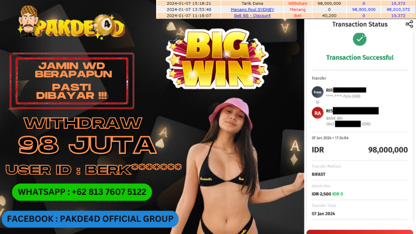 Selamat Kepada Member Setia PAKDE4D dengan USER ID : BERK******* di PERMAINAN TOGEL PASARAN SYDNEY POOLS RP. 98.000.000,- LUNAS langsung mendarat ke rekening tanpa bertele – tele. Terimakasih telah mempercayakan PAKDE4D sebagai Situs Bandar Terpercaya dan Terjamin Aman! Tunggu apalagi? Daftar sekarang juga bersama PAKDE4D dan dapatkan berbagai promo menarik setiap harinya.