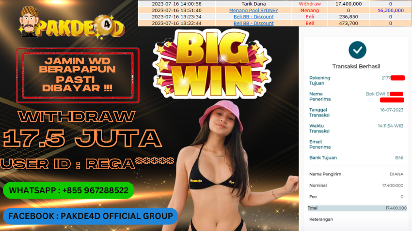 Selamat Kepada Member Setia PAKDE4D dengan USER ID : REGA**** di PERMAINAN TOGEL PASARAN SYDNEY sebesar Rp. 17.500.000,- LUNAS langsung mendarat ke rekening tanpa bertele – tele. Terimakasih telah mempercayakan PAKDE4D sebagai Situs Bandar Terpercaya dan Terjamin Aman! Tunggu apalagi? Daftar sekarang juga bersama PAKDE4D dan dapatkan berbagai promo menarik setiap harinya.
