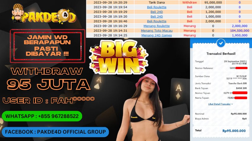 Selamat Kepada Member Setia PAKDE4D dengan USER ID : FAH*** di PERMAINAN TOGEL PASARAN TOTO MACAU4D sebesar Rp. 95.000.000,- LUNAS langsung mendarat ke rekening tanpa bertele – tele. Terimakasih telah mempercayakan PAKDE4D sebagai Situs Bandar Terpercaya dan Terjamin Aman! Tunggu apalagi? Daftar sekarang juga bersama PAKDE4D dan dapatkan berbagai promo menarik setiap harinya.