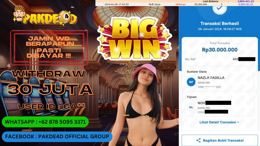 Selamat Kepada Member Setia PAKDE4D dengan USER ID : GA** di PERMAINAN TOGEL  RP. 30.000.000,- LUNAS langsung mendarat ke rekening tanpa bertele – tele. Terimakasih telah mempercayakan PAKDE4D sebagai Situs Bandar Terpercaya dan Terjamin Aman! Tunggu apalagi? Daftar sekarang juga bersama PAKDE4D dan dapatkan berbagai promo menarik setiap harinya.