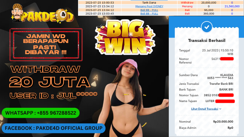 Selamat Kepada Member Setia PAKDE4D dengan USER ID : JUL***** di PERMAINAN TOGEL PASARAN SYDNEY sebesar Rp. 20.000.000,- LUNAS langsung mendarat ke rekening tanpa bertele – tele. Terimakasih telah mempercayakan PAKDE4D sebagai Situs Bandar Terpercaya dan Terjamin Aman! Tunggu apalagi? Daftar sekarang juga bersama PAKDE4D dan dapatkan berbagai promo menarik setiap harinya.